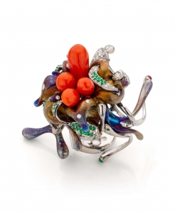 Maison De Greef – White gold and titanium ring Poison Ivy set with coral, brilliants and emerald